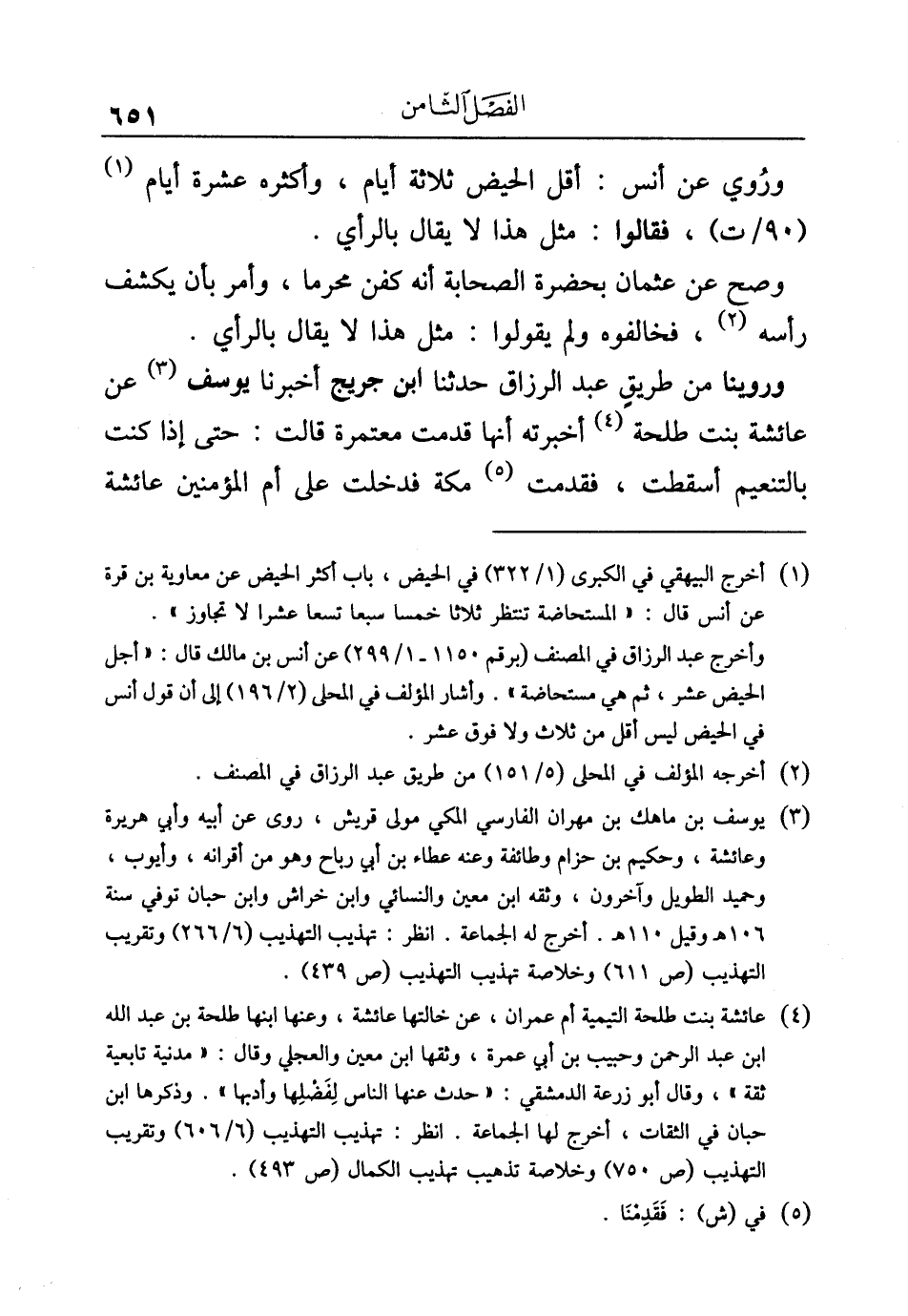 وأخرج عبد الرزاق في المصنف (برقم ١١٥٠ - ١/ ٢٩٩) عن أنس بن مالك قال: "أجل الحيض عشر، ثم هي مستحاضة". وأشار المؤلف في المحلى (٢/ ١٩٦) إلى أن قول أنس في الحيض ليس أقل من ثلاث ولا فوق عشر.