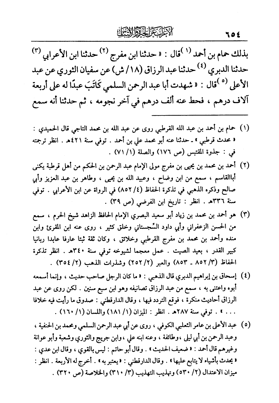 بذلك حمام بن أحمد (¬١) قال: "حدثنا ابن مفرج (¬٢) حدثنا ابن الأعرابي (¬٣) حدثنا الدبري (¬٤) حدثنا عبد الرزاق عن سفيان الثوري عن عبد الأعلى (¬٥) قال: "شهدت أبا عبد الرحمن السلمي كَاتَبَ عبدًا له على أربعة آلاف درهم، فحط عنه ألف درهم في آخر نجومه، ثم حدثنا أنه سمع