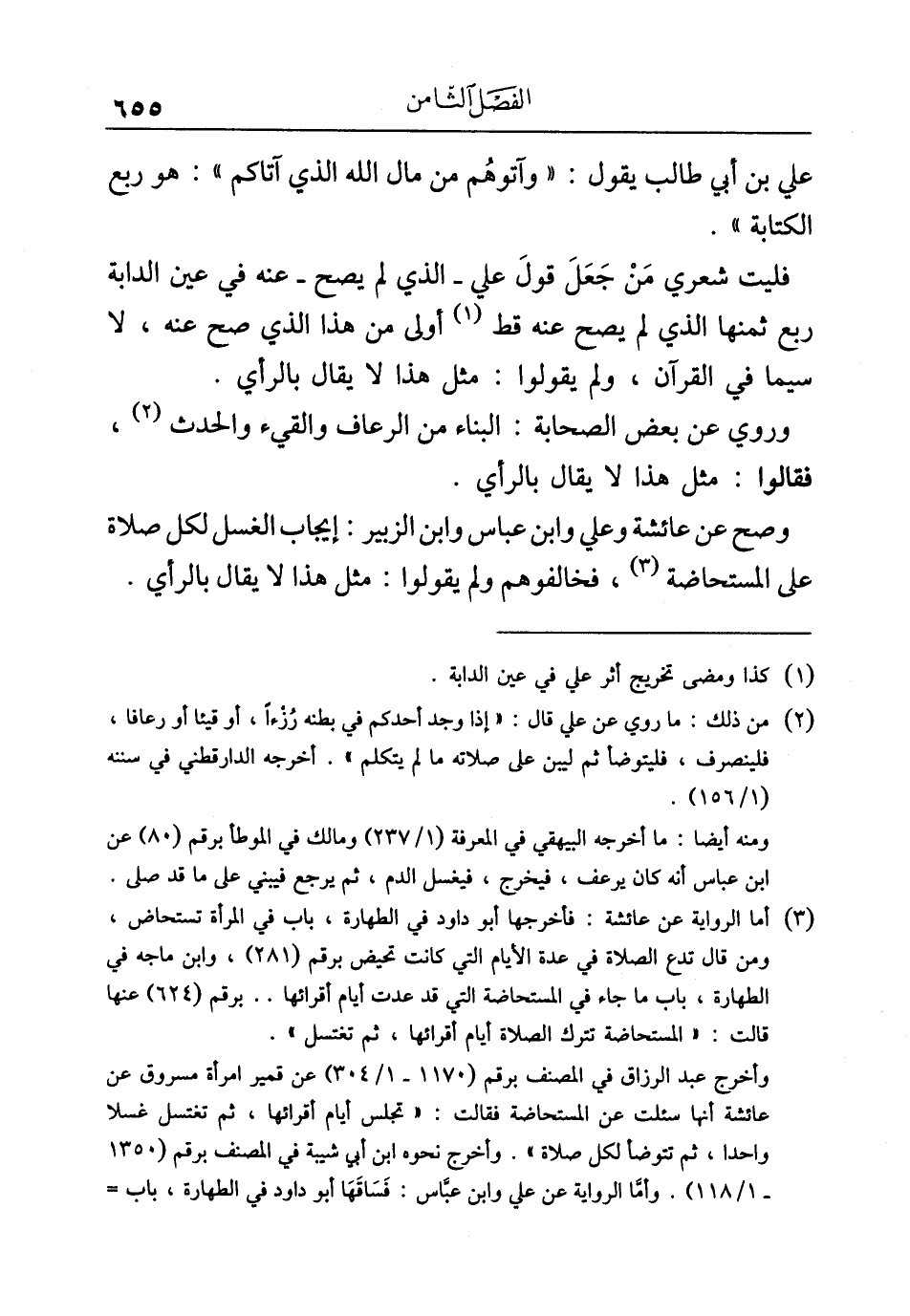 وصح عن عائشة وعلي وابن عباس وابن الزبير: إيجاب الغسل لكل صلاة على المستحاضة (¬٣)، فخالفوهم ولم يقولوا: مثل هذا لا يقال بالرأي.