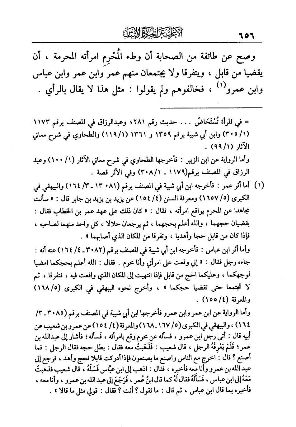 وصح عن طائفة من الصحابة أن وطءْ المُحْرِمِ امرأته المحرمة، أن يقضيا من قابل، ويتفرقا ولا يجتمعان منهم عمر وابن عمر وابن عباس وابن عمرو (¬١)، فخالفوهم ولم يقولوا: مثل هذا لا يقال بالرأي.