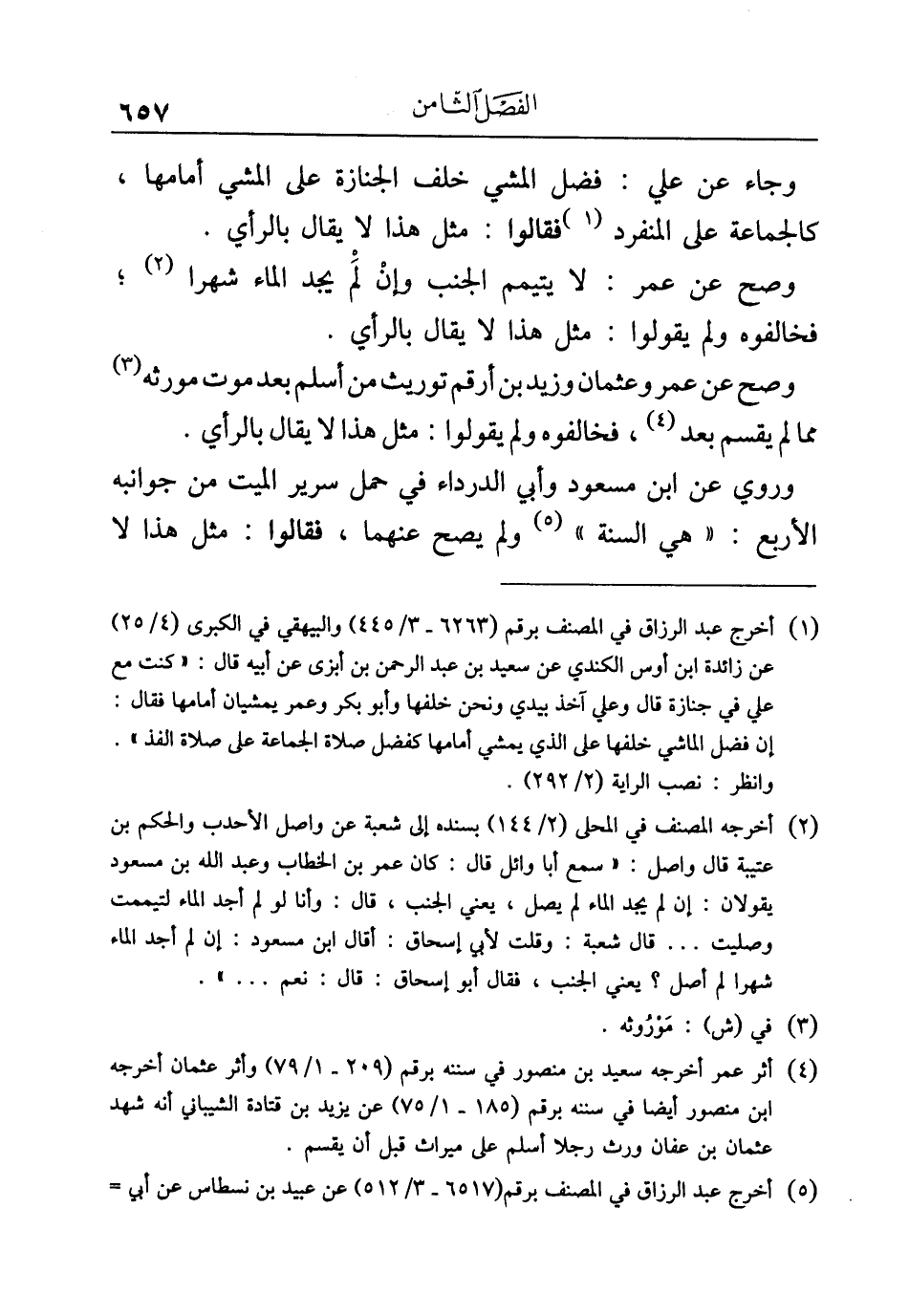 (¬١) أخرج عبد الرزاق في المصنف برقم (٦٢٦٣ - ٣/ ٤٤٥) والبيهقي في الكبرى (٤/ ٢٥) عن زائدة بن أوس الكندي عن سعيد بن عبد الرحمن بن أبزى عن أبيه قال: "كنت مع علي في جنازة قال وعلي آخذ بيدي ونحن خلفها وأبو بكر وعمر يمشيان أمامها فقال: إن فضل الماشي خلفها على الذي يمشي أمامها كفضل صلاة الجماعة على صلاة الفذ".