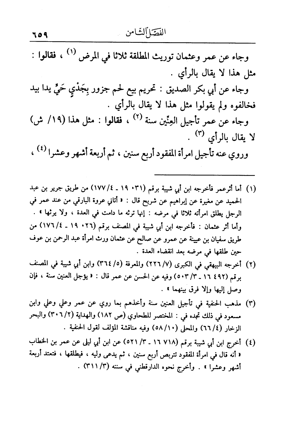 (¬٣) مذهب الحنفية في تأجيل العنين سنة وأخذهم بما روي عن عمر وعلي وعلي وابن مسعود في ذلك تجده في: المختصر للطحاوي (ص ١٨٢) والهداية (٢/ ٣٠٦) والبحر الزخار (٤/ ٦٦) والمحلى (١٠/ ٥٨) وفيه مناقشة المؤلف لقول الحنفية.