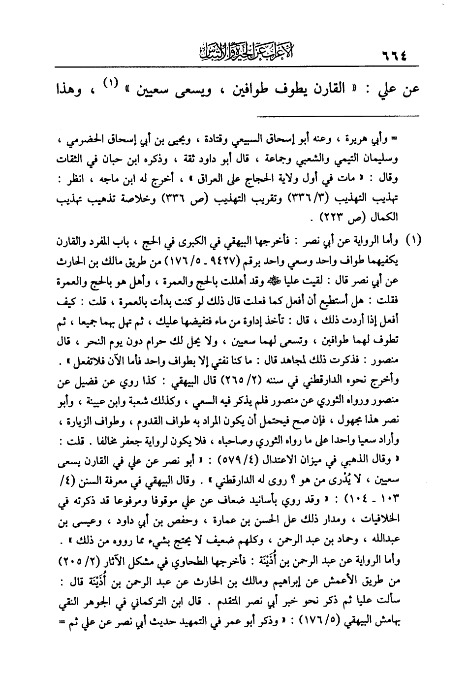 وأخرج نحوه الدارقطني في سننه (٢/ ٢٦٥) قال البيهقي: كذا روي عن فضيل عن منصور ورواه الثوري عن منصور فلم يذكر فيه السعي، وكذلك شعبة وابن عيينة، وأبو نصر هذا مجهول، فإن صح فيحتمل أن يكون المراد به طواف القدوم، وطواف الزيارة، وأراد سعيا واحدا على ما رواه الثوري وصاحباه، فلا يكون لرواية جعفر مخالفا. قلت: "وقال الذهبي في ميزان الاعتدال (٤/ ٥٧٩): "أبو نصر عن علي في القارن يسعى سعيين، لا يُدْرى من هو؟ روى له الدارقطني". وقال البيهقي في معرفة السنن (٤/ ١٠٣ - ١٠٤): "وقد روي بأسانيد ضعاف عن علي موقوفا ومرفوعا قد ذكرته في الخلافيات، ومدار ذلك على الحسن بن عمارة، وحفص بن أبي داود، وعيسى بن عبد الله، وحماد بن عبد الرحمن، وكلهم ضعيف لا يحتج بشيء مما رووه من ذلك".