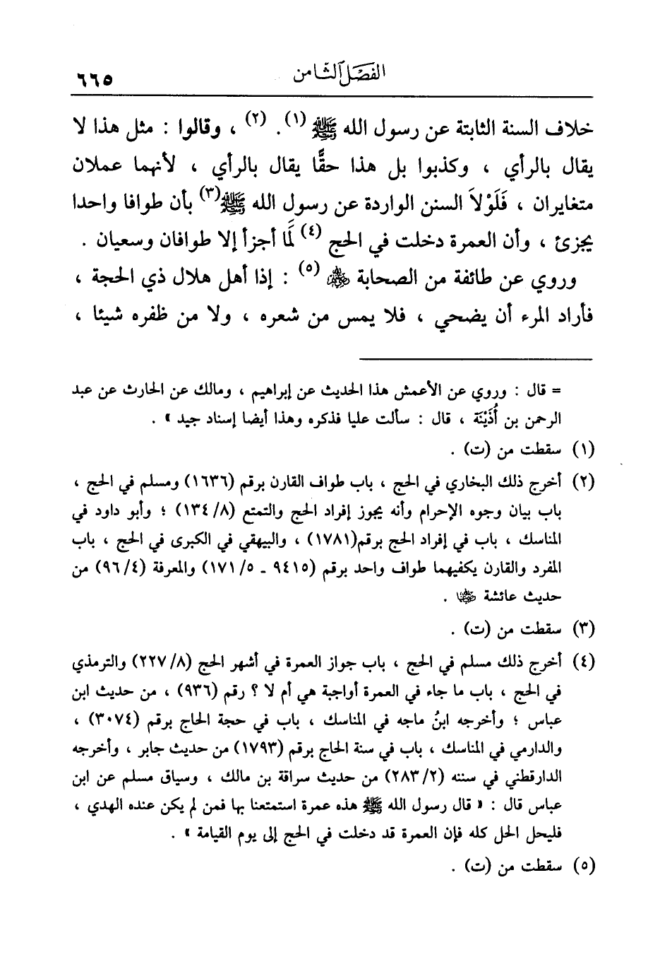 خلاف السنة الثابتة عن رسول الله - صلى الله عليه وسلم - (¬١). (¬٢)، وقالوا: مثل هذا لا يقال بالرأي، وكذبوا بل هذا حقًّا يقال بالرأي، لأنهما عملان متغايران، فَلَوْلَا السنن الواردة عن رسولِ الله - صلى الله عليه وسلم - (¬٣) بأن طوافا واحدا يجزئ، وأن العمرة دخلت في الحج (¬٤) لمَا أجزأ إلا طوافان وسعيان.