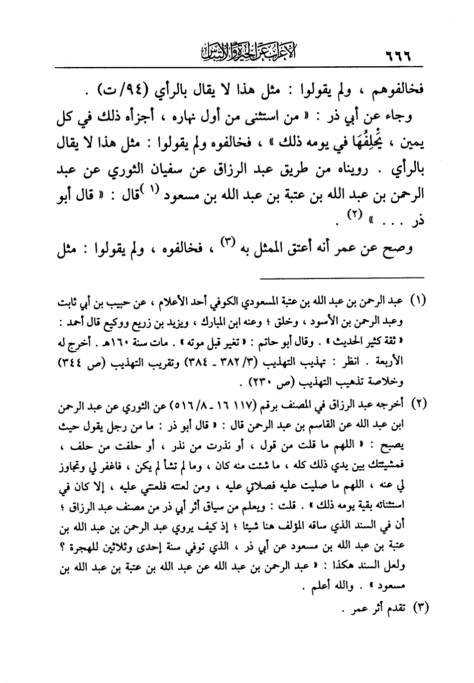 وجاء عن أبي ذر: "من استثنى من أول نهاره، أجزأه ذلك في كل يمين، يَحْلِفُهَا في يومه ذلك"، فخالفوه ولم يقولوا: مثل هذا لا يقال بالرأي. رويناه من طريق عبد الرزاق عن سفيان الثوري عن عبد الرحمن بن عبد الله بن عتبة بن عبد الله بن مسعود (¬١) قال: "قال أبو ذر ... " (¬٢).