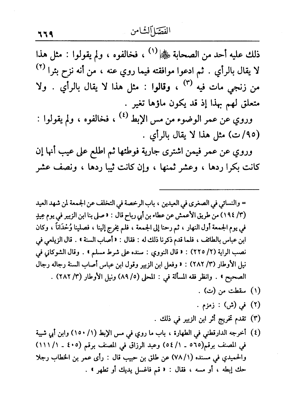 ذلك عليه أحد من الصحابة - رضي الله عنهم - (¬١)، فخالفوه، ولم يقولوا: مثل هذا لا يقال بالرأي. ثم ادعوا موافقته فيما روي عنه، من أنه نزح بئرا (¬٢) من زنجي مات فيه (¬٣)، وقالوا: مثل هذا لا يقال بالرأي. ولا متعلق لهم بهذا إذ قد يكون ماؤها تغير.