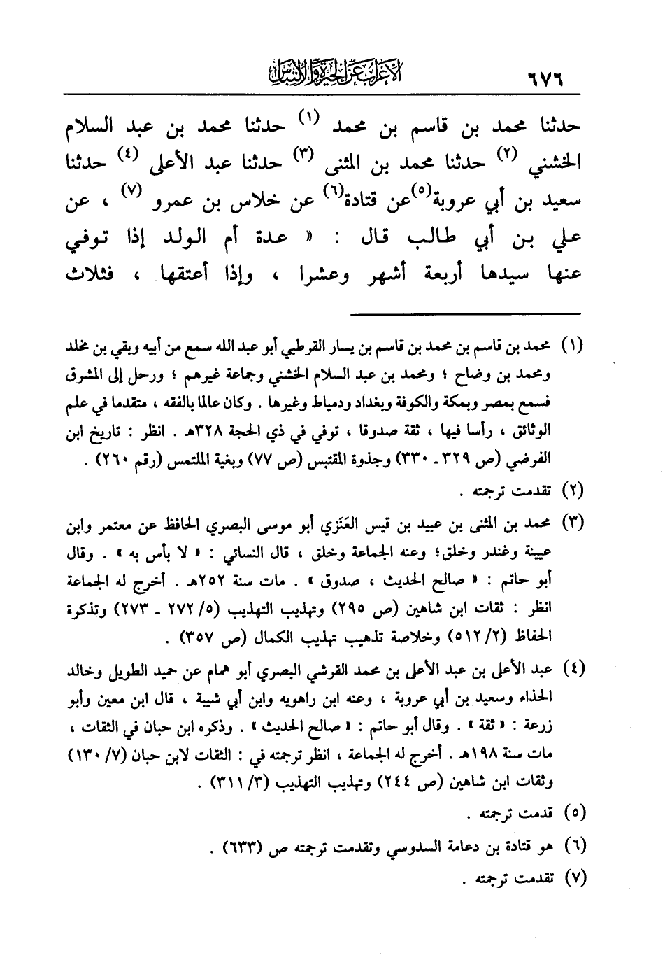 حدثنا محمد بن قاسم بن محمد (¬١) حدثنا محمد بن عبد السلام الخشني (¬٢) حدثنا محمد بن المثنى (¬٣) حدثنا عبد الأعلى (¬٤) حدثنا سعيد بن أبي عروبة (¬٥) عن قتادة (¬٦) عن خلاس بن عمرو (¬٧)، عن علي بن أبي طالب قال: "عدة أم الولد إذا توفي عنها سيدها أربعة أشهر وعشرا، وإذا أعتقها، فثلاث