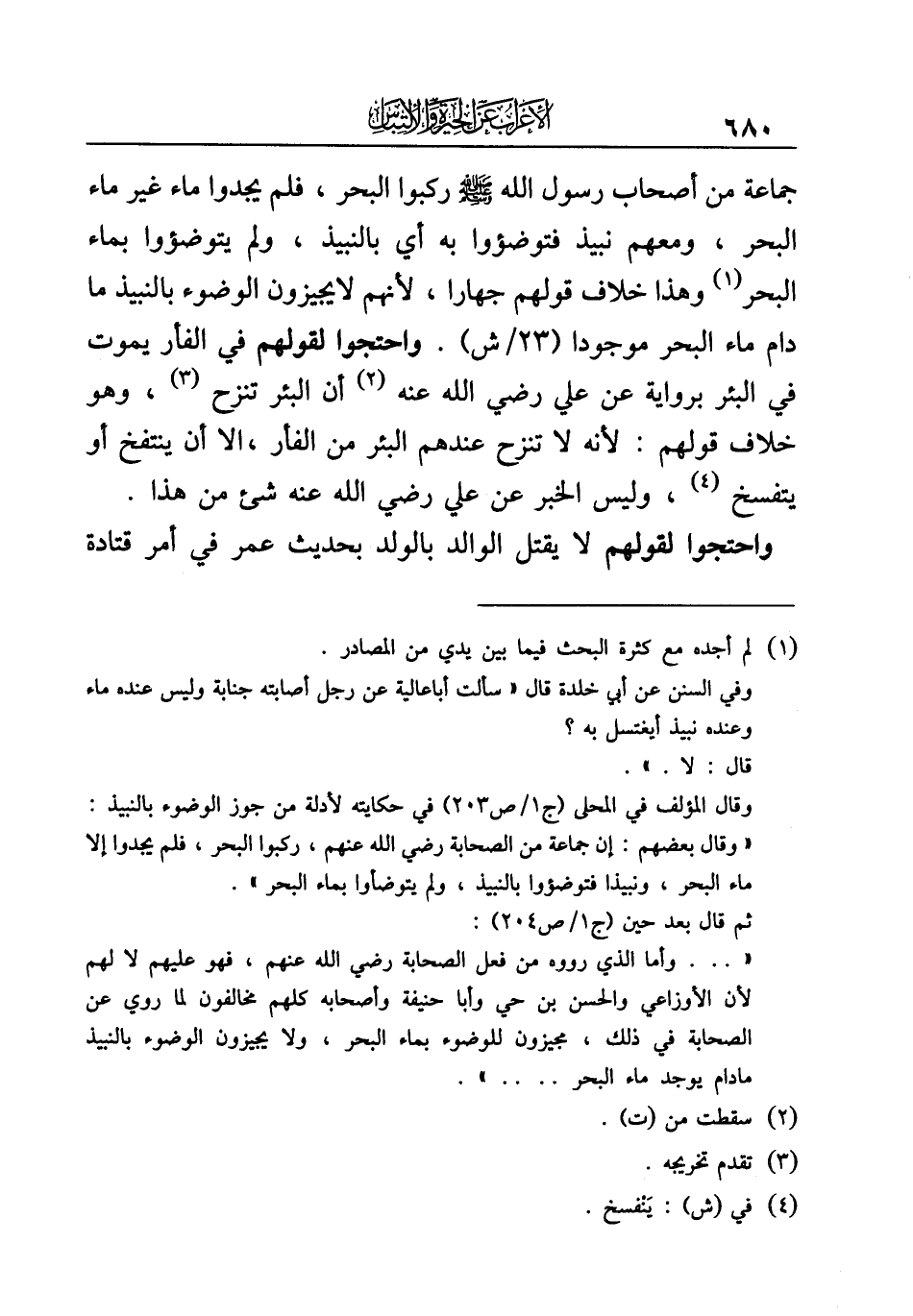 " ... وأما الذي رووه من فعل الصحابة رضي الله عنهم، فهو عليهم لا لهم لأن الأوزاعي والحسن بن حي وأبا حنيفة وأصحابه كلهم مخالفون لما روي عن الصحابة في ذلك، مجيزون للوضوء بماء البحر، ولا يجيزون الوضوء بالنبيذ ما دام يوجد ماء البحر .. .. ".