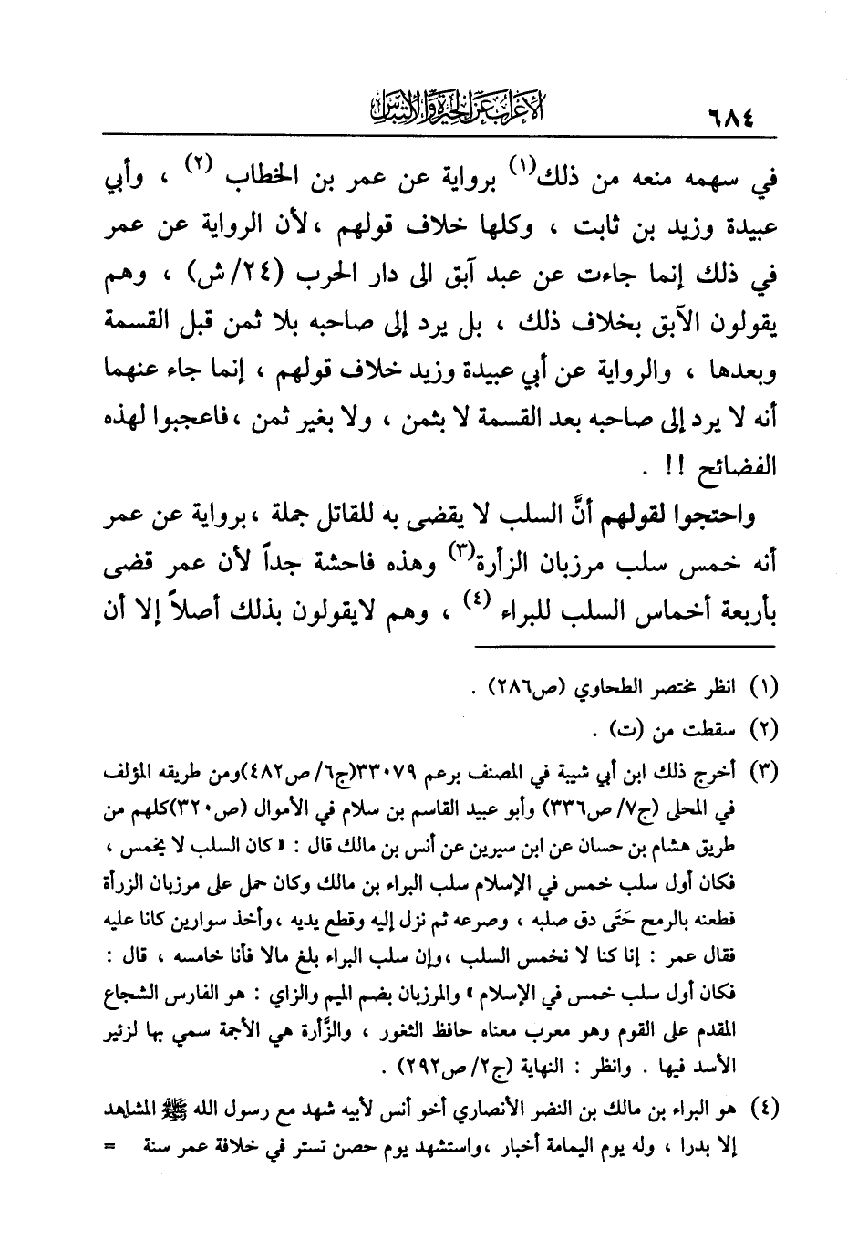 (¬٣) أخرج ذلك ابن أبي شيبة في المصنف برعم ٣٣٠٧٩ (ج ٦/ ص ٤٨٢) ومن طريقه المؤلف في المحلى (ج ٧/ ص ٣٣٦) وأبو عبيد القاسم بن سلام في الأموال (ص ٣٢٠) كلهم من طريق هشام بن حسان عن ابن سيرين عن أنس بن مالك قال: "كان السلب لا يخمس، فكان أول سلب خمس في الإسلام سلب البراء بن مالك وكان حمل على مرزبان الزرأة فطعنه بالرمح حَتَّى دق صلبه، وصرعه ثم نزل إليه وقطع يديه، وأخذ سوارين كانا عليه فقال عمر: إنا كنا لا نخمس السلب، وإن سلب البراء بلغ مالا فأنا خامسه، قال: فكان أول سلب خمس في الإسلام" والمرزبان بضم الميم والزاي: هو الفارس الشجاع المقدم على القوم وهو معرب معناه حافظ الثغور، والزَّأرة هي الأجمة سمي بها لزئير الأسد فيها، وانظر: النهاية (ج ٢/ ص ٢٩٢).