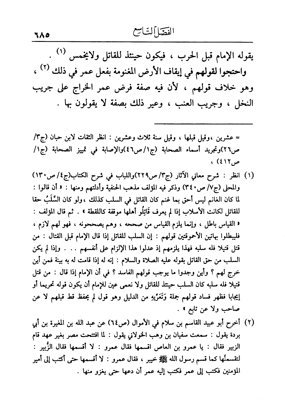 (¬١) انظر: شرح معاني الآثار (ج ٣/ ص ٢٢٩) واللباب في شرح الكتاب (ج ٤/ ص ١٣٠) والمحلى (ج ٧/ ص ٣٤٠) وذكر فيه المؤلف مذهب الحنفية وأدلتهم ومنها: "أن قالوا: لما كان الغانم ليس أحق بما غنم كان القاتل في السلب كذلك، ولو كان السَّلَبُ حقا للقاتل لكانت الأسلاب إذا لم يعرف قَاتِلُو أهلها موقفة كاللقطة". ثم قال المؤلف: "القياس باطل، وإنما يلزم القياس من صححه، وهم يصححونه، فهو لهم لازم، فليبطلوا بهاتين الأحموقتين قولهم: إن السلب للقاتل إذا قال الإمام قبل الققال: من قتل قتيلا فله سلبه فهذا يلزمهم إذ عدلوا هذا الإلزام على أنفسهم ... وإذا لم يكن السلب من حق القاتل بقوله عليه الصلاة والسلام: إنه له إذا قامت له به بينة فمن أين خرج لهم؟ وأين وجدوا ما يوجب قولهم الفاسد؟ في أن الإمام إذا قال: من قتل قتيلا فله سلبه كان السلب حينئذ للقاتل ولا نعمى عين للإمام أن يكون قوله تحريما أو إيجابا فظهر فساد قولهم جلة وَتَعَرِّيهِ من الدليل وهو قول لم يحفظ قط قبلهم لا عن صاحب ولا عن تابع".