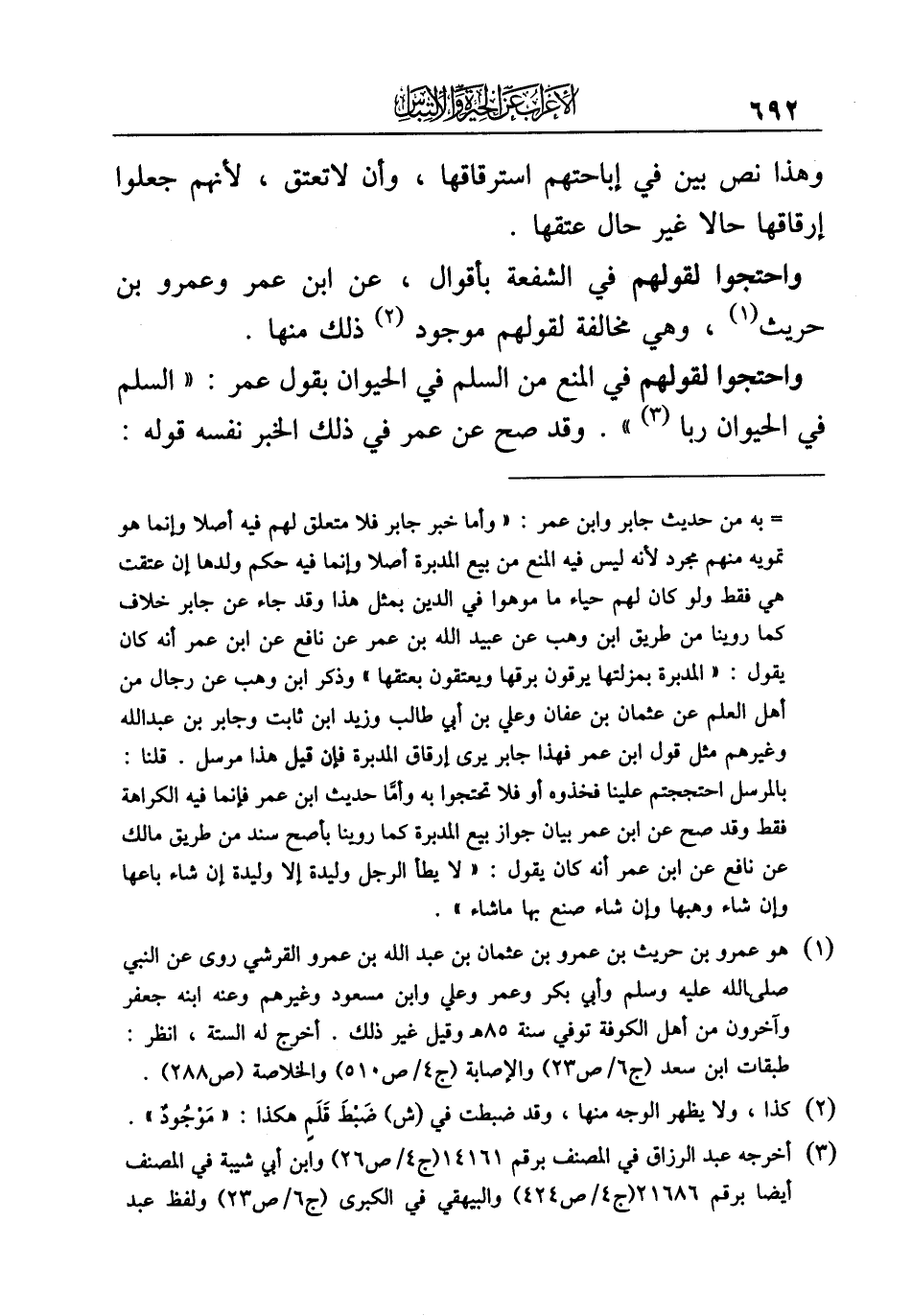 = به من حديث جابر وابن عمر: "وأما خبر جابر فلا متعلق لهم فيه أصلا وإنما هو تمويه منهم مجرد لأنه ليس فيه المنع من بيع المدبرة أصلا وإنما فيه حكم ولدها إن عتقت هي فقط ولو كان لهم حياء ما موهوا في الدين بمثل هذا وقد جاء عن جابر خلاف كما روينا من طريق ابن وهب عن عبيد الله بن عمر عن نافع عن ابن عمر أنه كان يقول: "المدبرة بمزلتها يرقون برقها ويعتقون بعتقها" وذكر ابن وهب عن رجال من أهل العلم عن عثمان بن عفان وعلي بن أبي طالب وزيد ابن ثابت وجابر بن عبد الله وغيرهم مثل قول ابن عمر فهذا جابر يرى إرقاق المدبرة فإن قيل هذا مرسل. قلنا: بالمرسل احتججتم علينا فخذوه أو فلا تحتجوا به وأمَّا حديث ابن عمر فإنما فيه الكراهة فقط وقد صح عن ابن عمر بيان جواز بيع المدبرة كما روينا بأصح سند من طريق مالك عن نافع عن ابن عمر أنه كان يقول: "لا يطأ الرجل وليدة إلا وليدة إن شاء باعها وإن شاء وهبها وإن شاء صنع بها ما شاء".