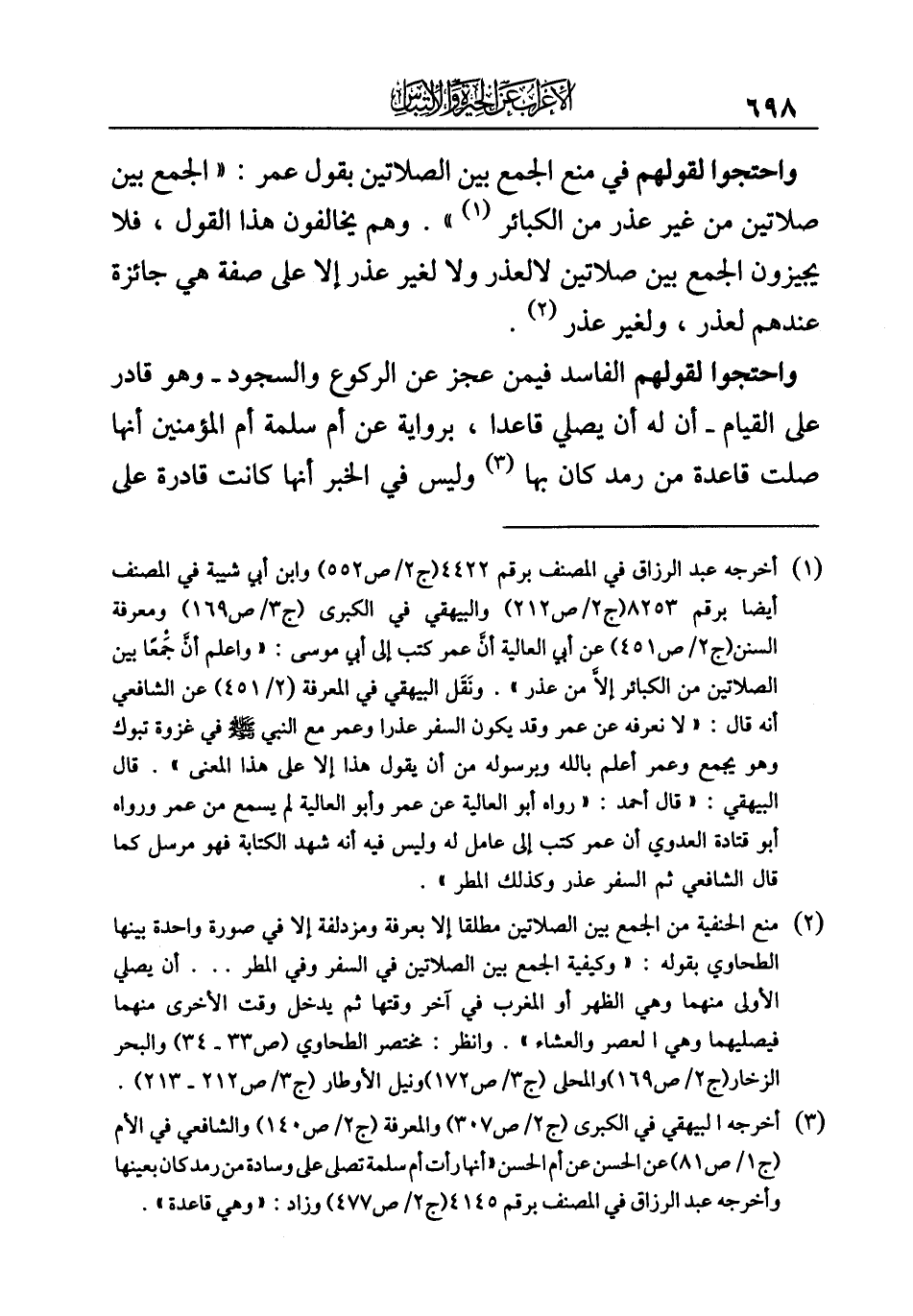 (¬٢) منع الحنفية من الجمع بين الصلاتين مطلقا إلا بعرفة ومزدلفة إلا في صورة واحدة بينها الطحاوي بقوله: "وكيفية الجمع بين الصلاتين في السفر وفي المطر ... أن يصلي الأولى منهما وهي الظهر أو المغرب في آخر وقتها ثم يدخل وقت الأخرى منهما فيصليهما وهي العصر والعشاء". وانظر: مختصر الطحاوي (ص ٣٣ - ٣٤) والبحر الزخار (ج ٢/ ص ١٦٩) والمحلى (ج ٣/ ع ١٧٢) ونيل الأوطار (ج ٣/ ع ٢١٢ - ٢١٣).
