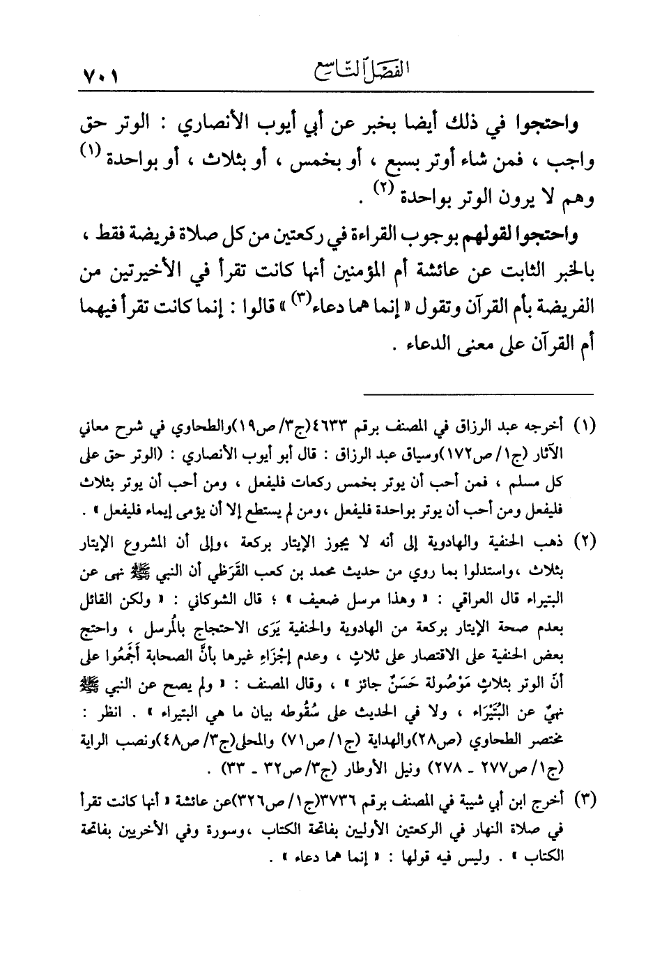 (¬٢) ذهب الحنفية والهادوية إلى أنه لا يجوز الإيتار بركعة، وإلى أن المشروع الإيتار بثلاث، واستدلوا بما روي من حديث محمد بن كعب القَرَظي أن النبي - صلى الله عليه وسلم - نهى عن البتيراء قال العراقي: "وهذا مرسل ضعيف"؛ قال الشوكاني: "ولكن القائل بعدم صحة الإيتار بركعة من الهادوية والحنفية يَرَى الاحتجاج بالمُرسل، واحتج بعض الحنفية على الاقتصار على ثلاثٍ، وعدم إجْزَاءِ غيرها بأنَّ الصحابة أَجْمَعُوا على أنّ الوتر بثلاثٍ مَوْصُولة حَسَنٌ جائز"، وقال المصنف: "ولم يصح عن النبي - صلى الله عليه وسلم - نهيٌ عن البُتَيْرَاء، ولا في الحديث على سُقُوطه بيان ما هي البتيراء". انظر: مختصر الطحاوي (ص ٢٨) والهداية (ج ١/ ص ٧١) والمحلى (ج ٣/ ص ٤٨) ونصب الراية (ج ١/ ص ٢٧٧ - ٢٧٨) ونيل الأوطار (ج ٣/ ص ٣٢ - ٣٣).