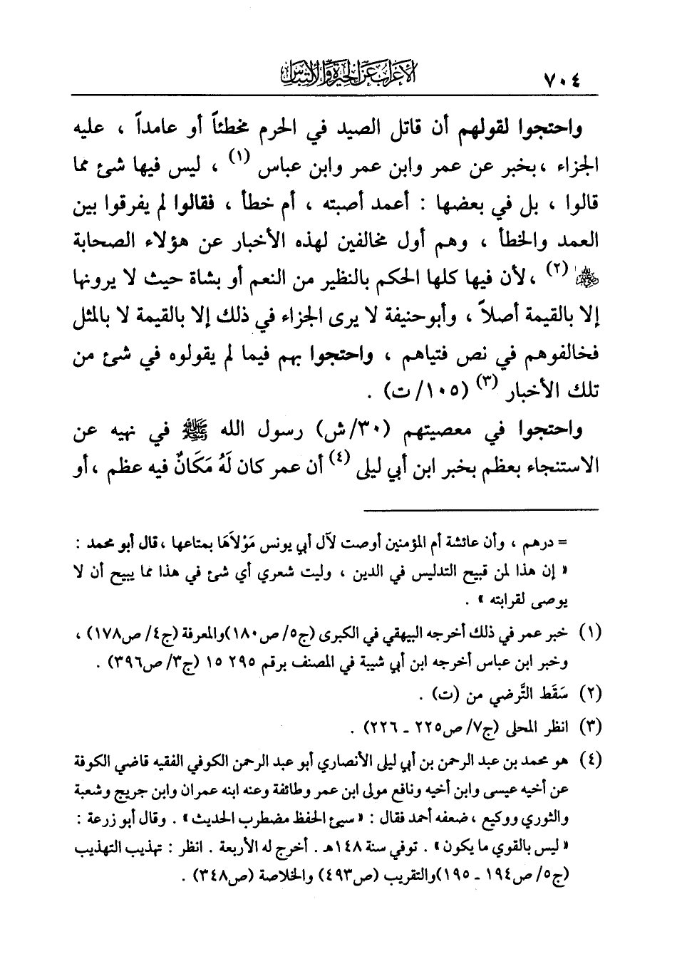 واحتجوا لقولهم أن قاتل الصيد في الحرم مخطئًا أو عامدًا، عليه الجزاء، بخبر عن عمر وابن عمر وابن عباس (¬١)، ليس فيها شيء مما قالوا، بل في بعضها: أعمد أصبته، أم خطأ، فقالوا لم يفرقوا بين العمد والخطأ، وهم أول مخالفين لهذه الأخبار عن هؤلاء الصحابة - رضي الله عنهم - (¬٢)، لأن فيها كلها الحكم بالنظير من النعم أو بشاة حيث لا يرونها إلا بالقيمة أصلًا، وأبو حنيفة لا يرى الجزاء في ذلك إلا بالقيمة لا بالمثل فخالفوهم في نص فتياهم، واحتجوا بهم فيما لم يقولوه في شيء من تلك الأخبار (¬٣).