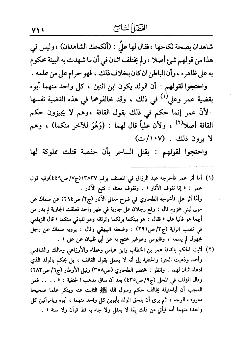 (¬٢) أثبت الحكم بالقافة عمر بن الخطاب وابن عباس وعطاء والأوزاعي ومالك والشافعي وأحمد وذهبت العترة والحنفية إلى أنه لا يعمل بقول القائف، بل يحكم بالولد الذي ادعاه اثنان لهما. وانظر: مختصر الطحاوي (ص ٣٥٨) ونيل الأوطار (ج ٦/ ص ٢٨٣) وقال المؤلف في المحلى (ج ٩/ ص ٤٣٥) بعد أن ساق مذهب الحنفية: " .... فمن العجب أن أبا حنيفة يخالف حكم رسول الله - صلى الله عليه وسلم - الثابت عنه وينكر علما صحيحا معروف الوجه، ثم يرى أن يلحق الولد بأبوين كل واحد منهما، أبوه وبامرأتين كل واحدة منهما أمه فيأتي من ذلك بِمَا لا يعقل ولا جاء به قط قرآن ولا سنة".