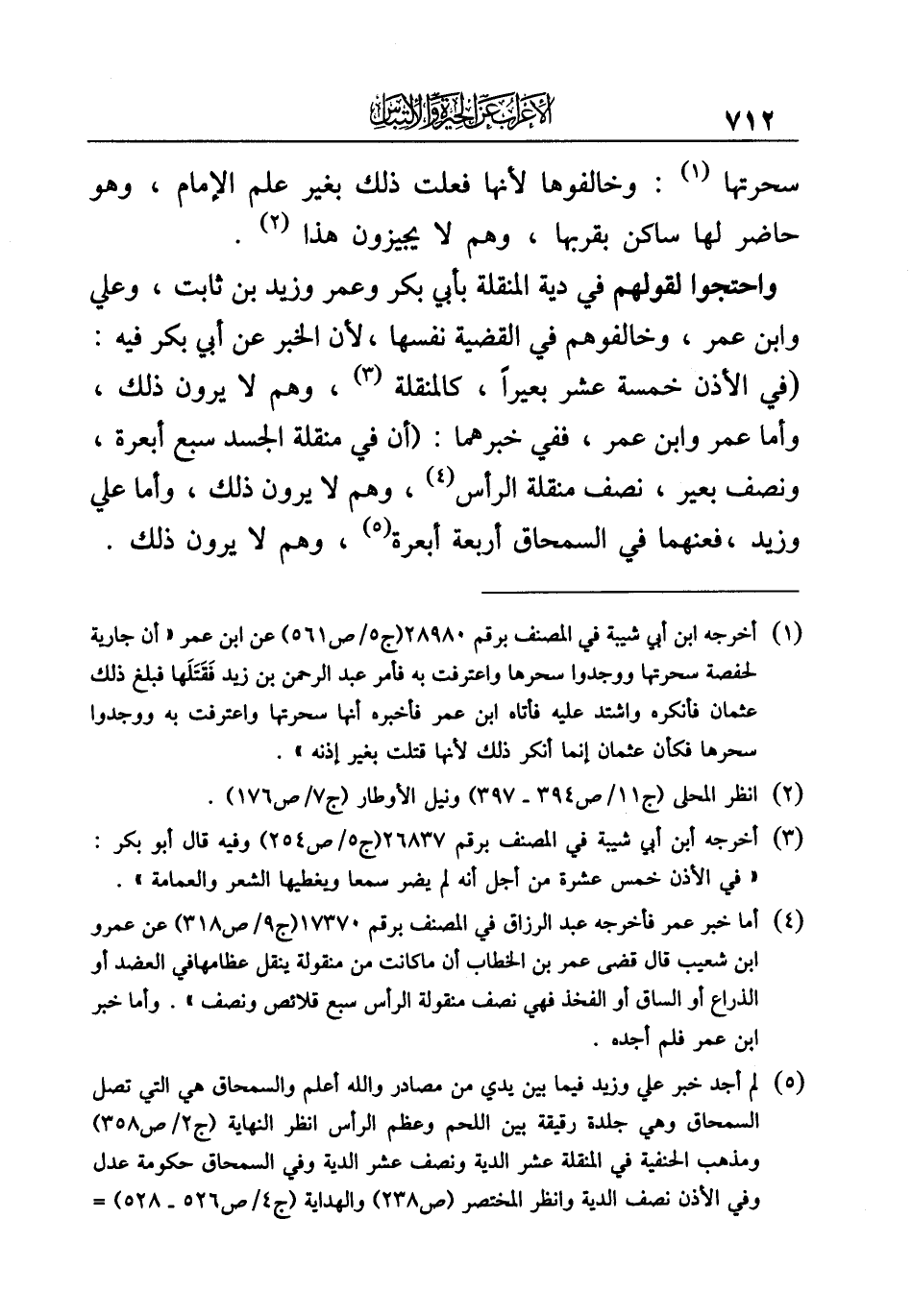 (¬٤) أما خبر عمر فأخرجه عبد الرزاق في المصنف برقم ١٧٣٧٠ (ج ٩/ ص ٣١٨) عن عمرو بن شعيب قال قضى عمر بن الخطاب أن ما كانت من منقولة ينقل عظامها في العضد أو الذراع أو الساق أو الفخذ فهي نصف منقولة الرأس سبع قلائص ونصف". وأما خبر ابن عمر فلم أجده.