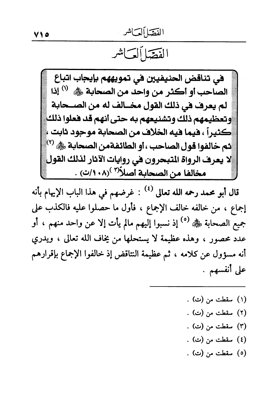 الفَصْل العَاشر في تناقض الحنفيين في تمويههم بإيجاب اتباع الصاحب أو أكثر من واحد من الصحابة - رضي الله عنهم - (¬١) إذا لم يعرف في ذلك القول مخالف له من الصحابة وتعظيمهم ذلك وتشنيعهم به حتى أنهم قد فعلوا ذلك كثيرًا، فيما فيه الخلاف من الصحابة موجود ثابت، ثم خالفوا قول الصاحب، أو الطائفة من الصحابة - رضي الله عنهم - (¬٢) لا يعرف الرواة المتبحرون في روايات الآثار لذلك القول مخالفا من الصحابة أصلًا (¬٣)