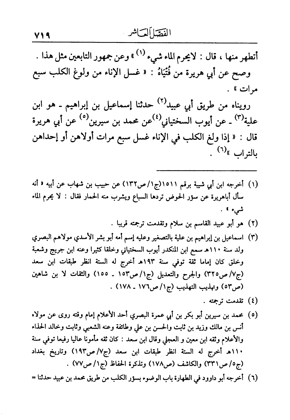 رويناه من طريق أبي عبيد (¬٢) حدثنا إسماعيل بن إبراهيم - هو ابن علية (¬٣) - عن أيوب السختياني (¬٤) عن محمد بن سيرين (¬٥) عن أبي هريرة قال: "إذا ولغ الكلب في الإناء غسل سبع مرات أولاهن أو إحداهن بالتراب" (¬٦).