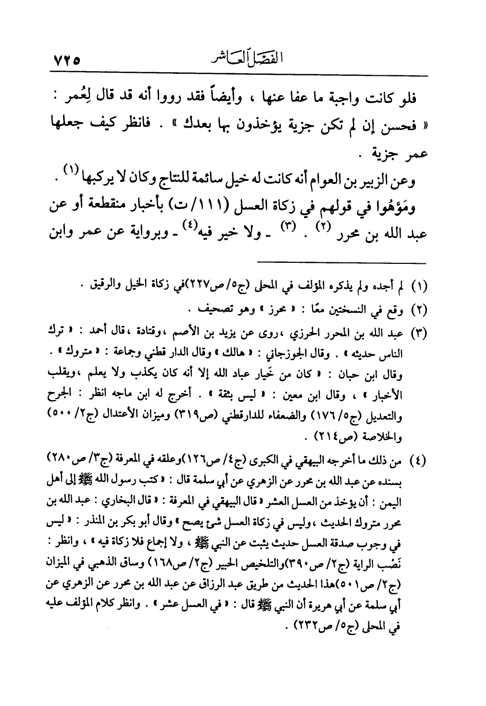 (¬٤) من ذلك ما أخرجه البيهقي في الكبرى (ج ٤/ ص ١٢٦) وعلقه في المعرفة (ج ٣/ ص ٢٨٠) بسنده عن عبد الله بن محرر عن الزهري عن أبي سلمة قال: "كتب رسول الله - صلى الله عليه وسلم - إلى أهل اليمن: أن يؤخذ من العسل العشر "قال البيهقي في المعرفة: "قال البخاري: عبد الله بن محرر متروك الحديث، وليس في زكاة العسل شيء يصح" وقال أبو بكر بن المنذر: "ليس في وجوب صدقة العسل حديث يثبت عن النبي - صلى الله عليه وسلم -، ولا إجماع فلا زكاة فيه"، وانظر: نَصْب الراية (ج ٢/ ص ٣٩٠) والتلخيص الحبير (ج ٢/ ص ١٦٨) وساق الذهبي في الميزان (ج ٢/ ص ٥٠١) هذا الحديث من طريق عبد الرزاق عن عبد الله بن محرر عن الزهري عن أبي سلمة عن أبي هريرة أن النبي - صلى الله عليه وسلم - قال: "في العسل عشر". وانظر كلام المؤلف عليه في المحلى (ج ٥/ ص ٢٣٢).