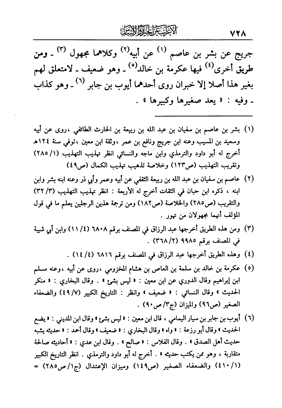 جريج عن بشر بن عاصم (¬١) عن أبيه (¬٢) وكلاهما مجهول (¬٣) - ومن طريق أخرى (¬٤) فيها عكرمة بن خالد (¬٥) - وهو ضعيف - لا متعلق لهم بغير هذا أصلا إلا خبران روى أحدهما أيوب بن جابر (¬٦) - وهو كذاب - وفيه: "يعد صغيرها وكبيرها".