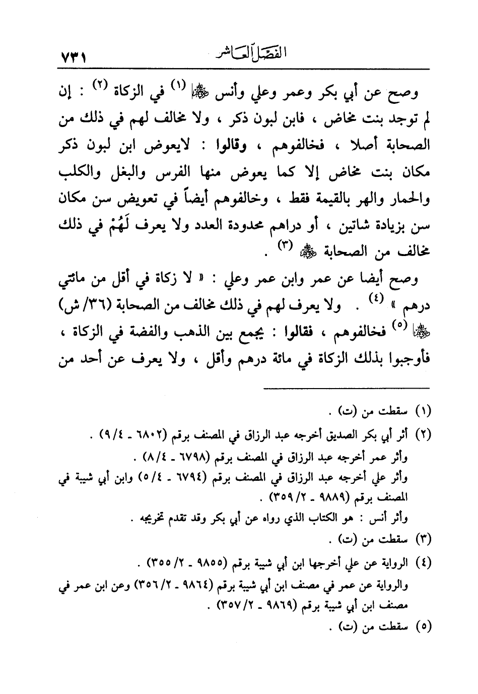 وصح عن أبي بكر وعمر وعلي وأنس - رضي الله عنهم - (¬١) في الزكاة (¬٢): إن لم توجد بنت مخاض، فابن لبون ذكر، ولا مخالف لهم في ذلك من الصحابة أصلا، فخالفوهم، وقالوا: لا يعوض ابن لبون ذكر مكان بنت مخاض إلا كما يعوض منها الفرس والبغل والكلب والحمار والهر بالقيمة فقط، وخالفوهم أيضًا في تعويض سن مكان سن بزيادة شاتين، أو دراهم محدودة العدد ولا يعرف لَهُمْ في ذلك مخالف من الصحابة - رضي الله عنهم - (¬٣).