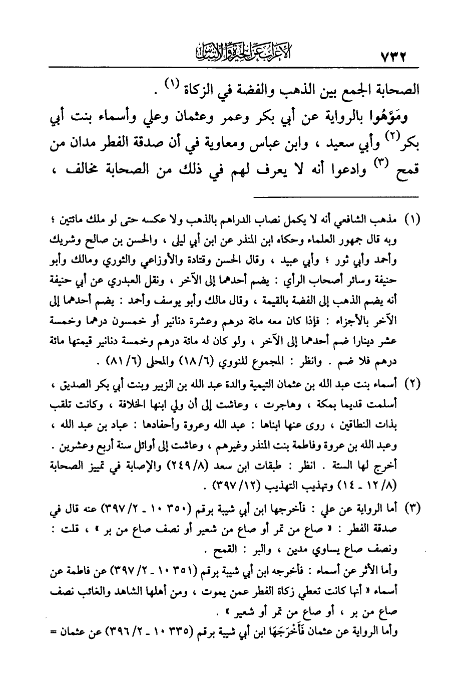 ومَوَّهُوا بالرواية عن أبي بكر وعمر وعثمان وعلي وأسماء بنت أبي بكر (¬٢) وأبي سعيد، وابن عباس ومعاوية في أن صدقة الفطر مدان من قمح (¬٣) وادعوا أنه لا يعرف لهم في ذلك من الصحابة مخالف،