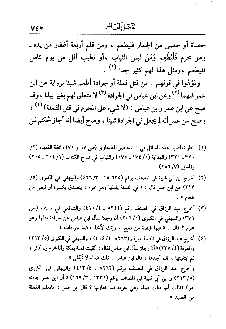 (¬٣) أخرج عبد الرزاق في المصنف رقم (٨٢٤٤ - ٤/ ٤١٠) والشافعي في مسنده (ص ٣٧١) والبيهقي في الكبرى (٥/ ٢٠٦) أن رجلا سأل ابن عباس عن جرادة قتلها وهو محرم؟ قال: "فيها قبضة من قمح، وإنك لآخذ قبضة جرادات".