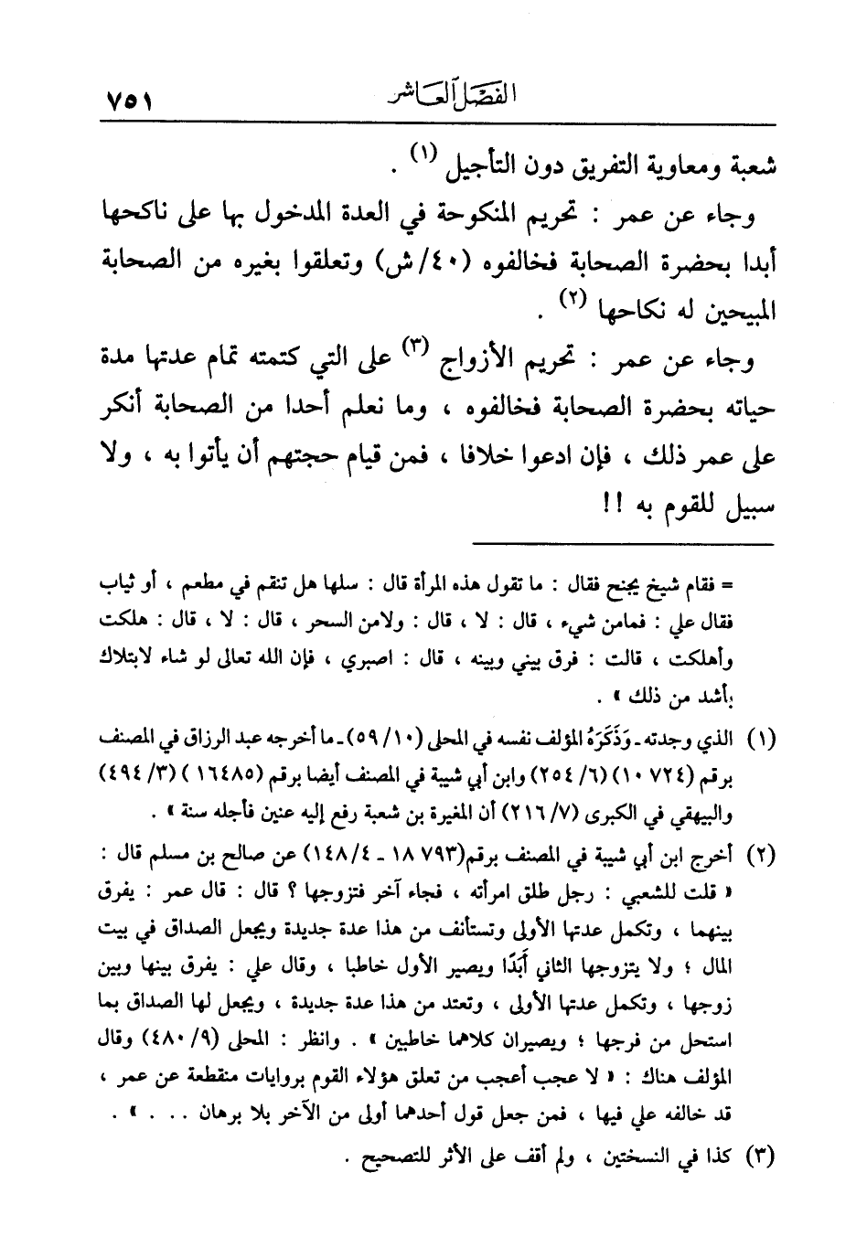 (¬٢) أخرج ابن أبي شيبة في المصنف برقم (١٨٧٩٣ - ٤/ ١٤٨) عن صالح بن مسلم قال: "قلت للشعبي: رجل طلق امرأته، فجاء آخر فتزوجها؟ قال: قال عمر: يفرق بينهما، وتكمل عدتها الأولى وتستأنف من هذا عدة جديدة ويجعل الصداق في بيت المال؛ ولا يتزوجها الثاني أَبَدًا ويصير الأول خاطبا، وقال علي: يفرق بينها وبين زوجها، وتكمل عدتها الأولى، وتعتد من هذا عدة جديدة، ويجعل لها الصداق بما استحل من فرجها؛ ويصيران كلاما خاطبين". وانظر: المحلى (٩/ ٤٨٠) وقال المؤلف هناك: "لا عجب أعجب من تعلق هؤلاء القوم بروايات منقطعة عن عمر، قد خالفه علي فيها، فمن جعل قول أحدما أولى من الآخر بلا برهان ... ".