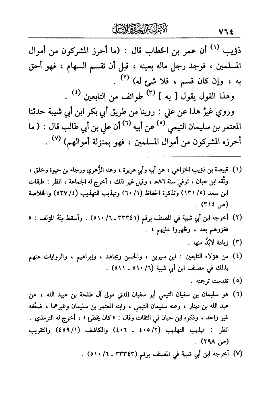 ذؤيب (¬١) أن عمر بن الخطاب قال: (ما أحرز المشركون من أموال المسلمين، فوجد رجل ماله بعينه، قبل أن تقسم السهام، فهو أحق به، وإن كان قسم، فلا شيء له) (¬٢).