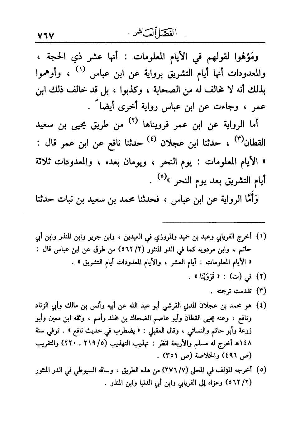 أما الرواية عن ابن عمر فرويناها (¬٢) من طريق يحيى بن سعيد القطان (¬٣)، حدثنا ابن عجلان (¬٤) حدثنا نافع عن ابن عمر قال: "الأيام المعلومات: يوم النحر، ويومان بعده، والمعدودات ثلاثة أيام التشريق بعد يوم النحر" (¬٥).