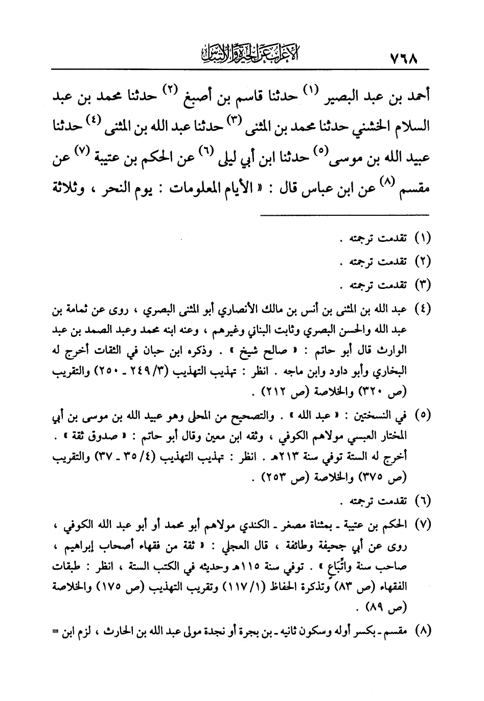 أحمد بن عبد البصير (¬١) حدثنا قاسم بن أصبغ (¬٢) حدثنا محمد بن عبد السلام الخشني حدثنا محمد بن المثنى (¬٣) حدثنا عبد الله بن المثنى (¬٤) حدثنا عبيد الله بن موسى (¬٥) حدثنا ابن أبي ليلى (¬٦) عن الحكم بن عتيبة (¬٧) عن مقسم (¬٨) عن ابن عباس قال: "الأيام المعلومات: يوم النحر، وثلاثة