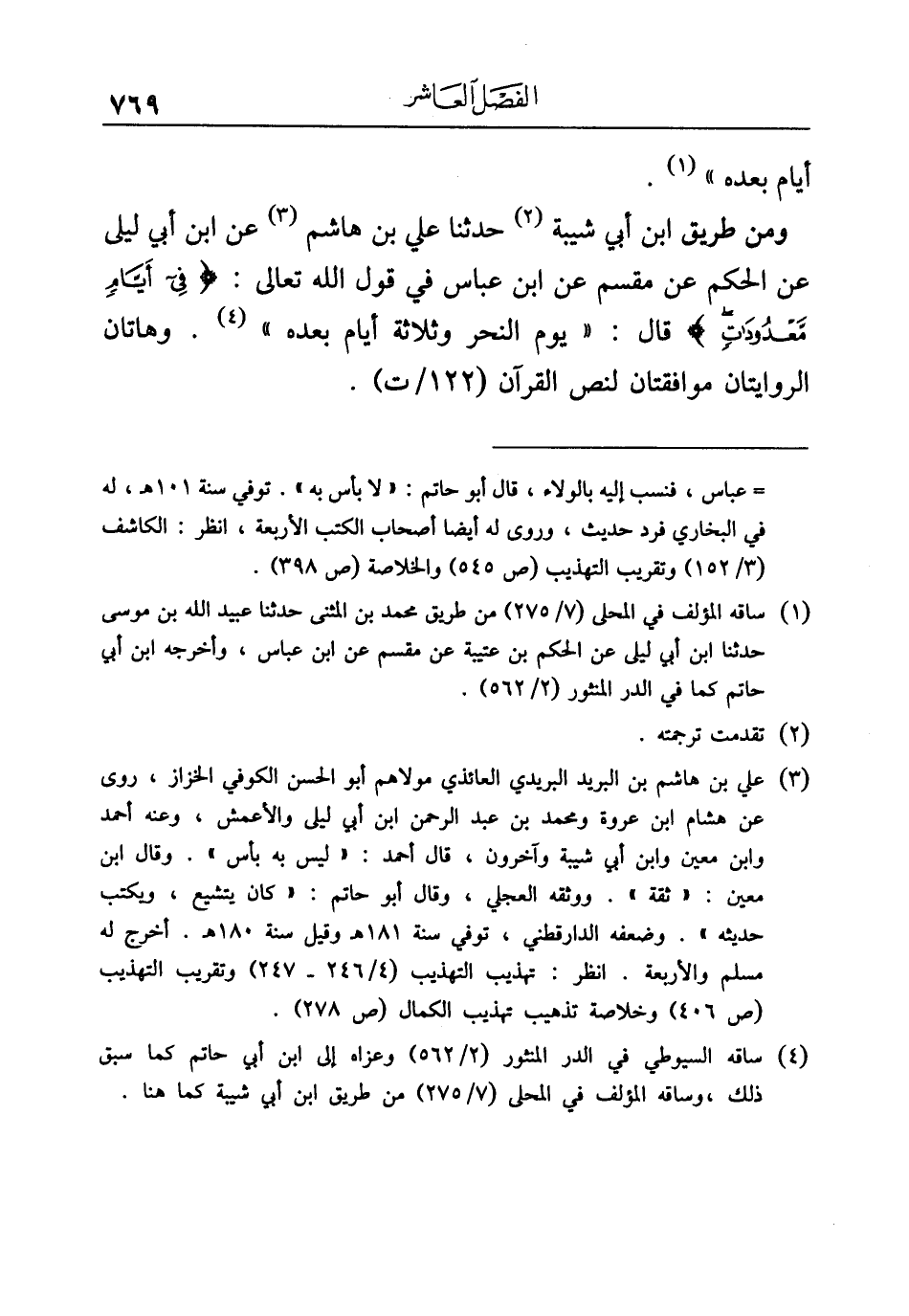 ومن طريق ابن أبي شيبة (¬٢) حدثنا علي بن هاشم (¬٣) عن ابن أبي ليلى عن الحكم عن مقسم عن ابن عباس في قول الله تعالى: {فِي أَيَّامٍ مَعْدُودَاتٍ} قال: "يوم النحر وثلاثة أيام بعده" (¬٤). وهاتان الروايتان موافقتان لنص القرآن.
