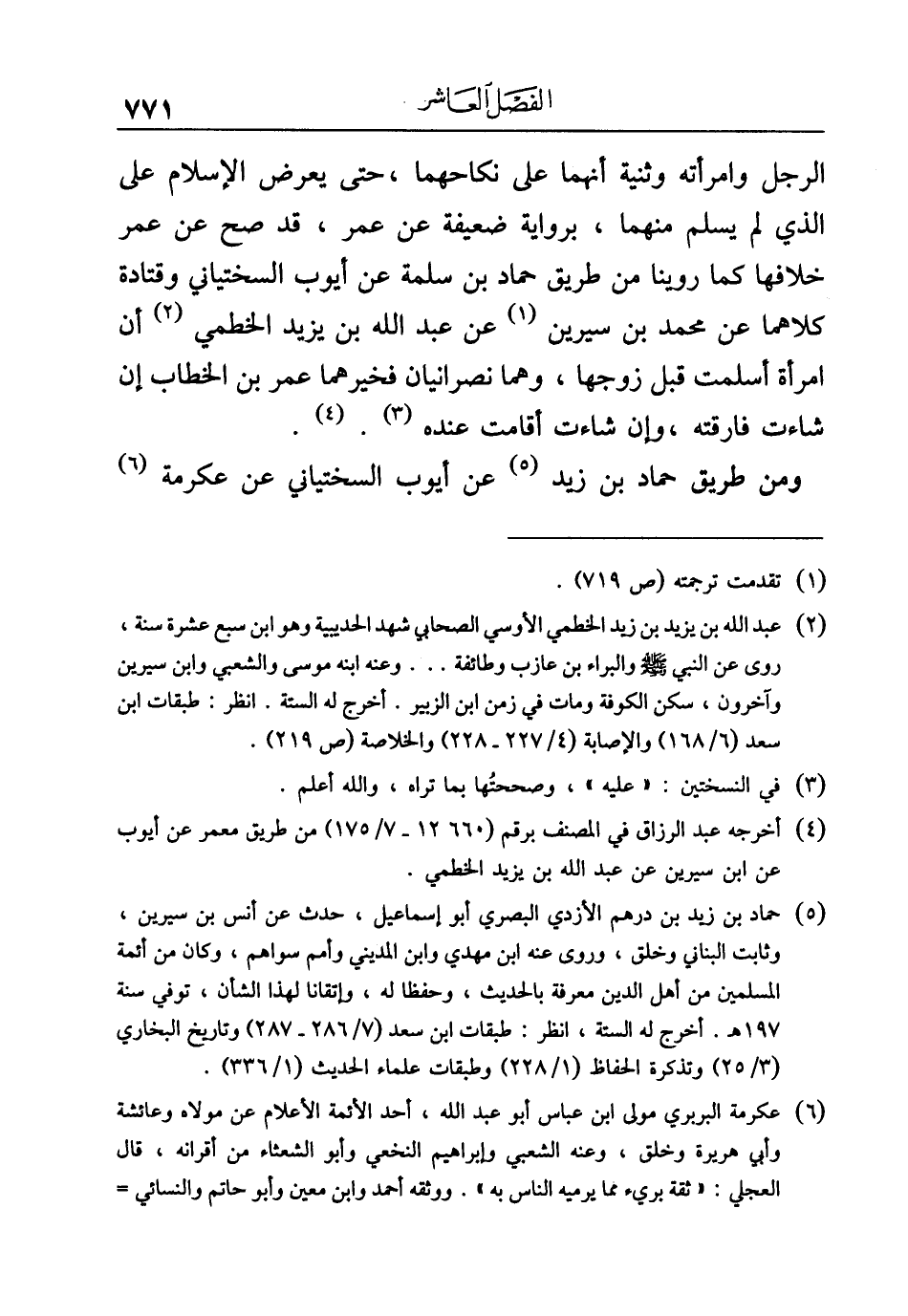 الرجل وامرأته وثنية أنهما على نكاحهما، حتى يعرض الإسلام على الذي لم يسلم منهما، برواية ضعيفة عن عمر، قد صح عن عمر خلافها كما روينا من طريق حماد بن سلمة عن أيوب السختياني وقتادة كلاهما عن محمد بن سيرين (¬١) عن عبد الله بن يزيد الخطمي (¬٢) أن امرأة أسلمت قبل زوجها، وهما نصرانيان فخيرهما عمر بن الخطاب إن شاءت فارقته، وإن شاءت أقامت عنده (¬٣). (¬٤).