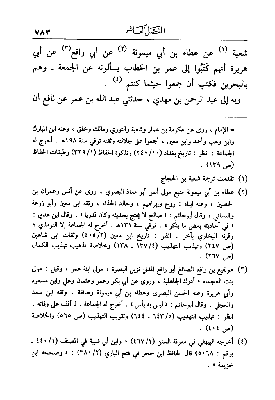 شعبة (¬١) عن عطاء بن أبي ميمونة (¬٢) عن أبي رافع (¬٣) عن أبي هريرة أنهم كَتَبُوا إلى عمر بن الخطاب يسألونه عن الجمعة - وهم بالبحرين فكتب أن جمعوا حيثما كنتم (¬٤).