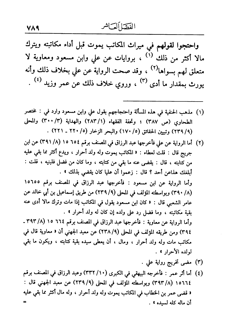 (¬١) مذهب الحنفية في هذه المسألة واحتجاجهم بقول علي وابن مسعود وارد في: مختصر الطحاوي (ص ٣٨٧)؛ وتحفة الفقهاء (١/ ٢٨٣) والهداية (٣/ ٣٠٠) والمحلى (٩/ ٢٣٩) وتبيين الحقائق (٥/ ١٧٠) والبحر الزخار (٥/ ٢٢٠ - ٢٢١).