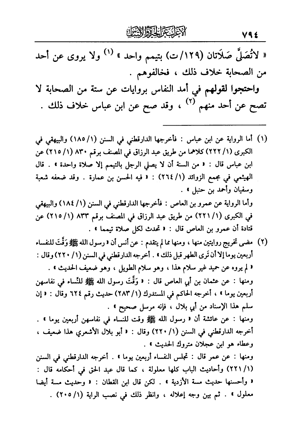 (¬٢) مضى تخريج روايتين منها، ومنها مما لم يتقدم: عن أنس أن "رسول الله - صلى الله عليه وسلم - وَقَّتَ للنفساء أربعين يوما إلا أن تَرى الطهر قبل ذلك". أخرجه الدارقطني في السنن (١/ ٢٢٠) وقال: "لم يروه عن حميد غير سلام هذا، وهو سلام الطويل، وهو ضعيف الحديث".