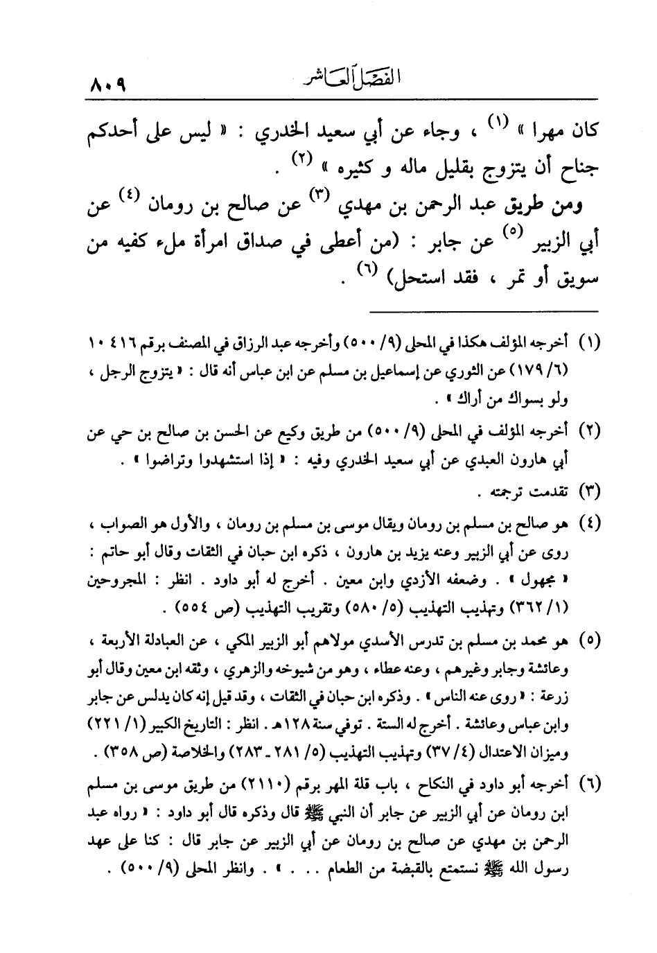 ومن طريق عبد الرحمن بن مهدي (¬٣) عن صالح بن رومان (¬٤) عن أبي الزبير (¬٥) عن جابر: (من أعطى في صداق امرأة ملء كفيه من سويق أو تمر، فقد استحل) (¬٦).