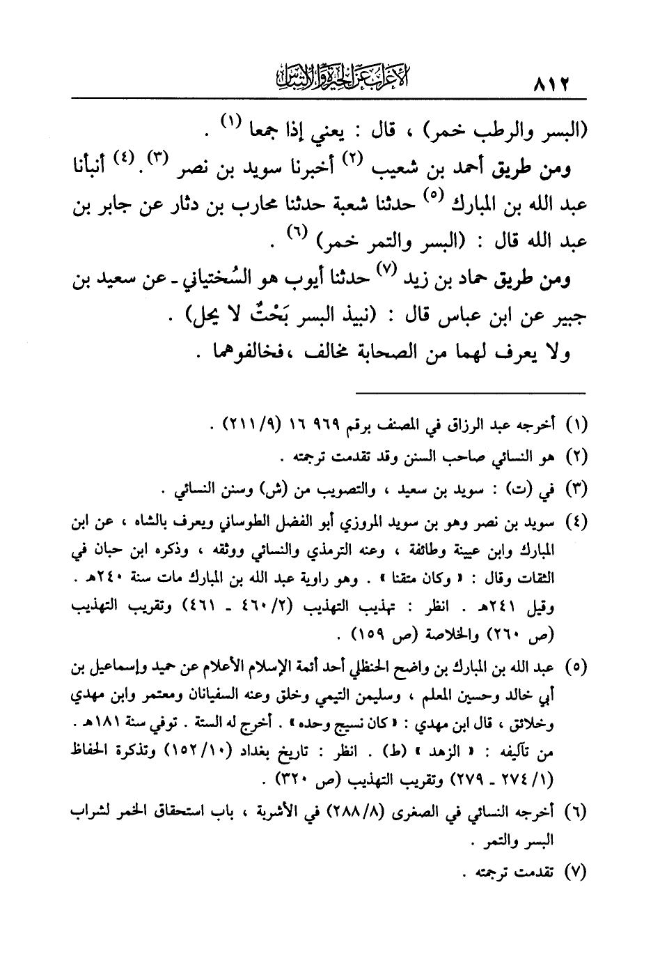 (¬٥) عبد الله بن المبارك بن واضح الحنظلي أحد أئمة الإسلام الأعلام عن حميد وإسماعيل بن أبي خالد وحسين المعلم، وسليمن التيمي وخلق وعنه السفيانان ومعتمر وابن مهدي وخلائق، قال ابن مهدي: "كان نسيج وحده". أخرج له الستة. توفي سنة ١٨١ هـ.