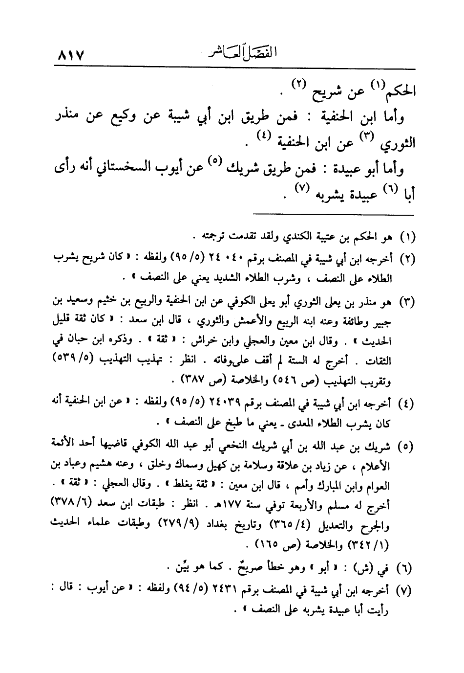 (¬٥) شريك بن عبد الله بن أبي شريك النخعي أبو عبد الله الكوفي قاضيها أحد الأئمة الأعلام، عن زياد بن علاقة وسلامة بن كهيل وسماك وخلق، وعنه هشيم وعباد بن العوام وابن المبارك وأمم، قال ابن معين: "ثقة يغلط". وقال العجلي: "ثقة".