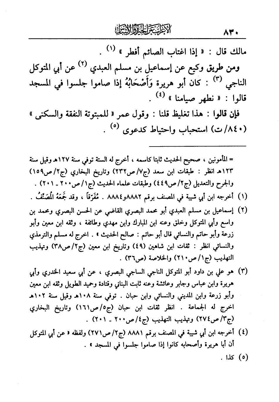 (¬٤) أخرجه ابن أبي شيبة في المصنف برقم ٨٨٨١ (ج ٢/ ص ٢٧١) ولفظه "عن أبي المتوكل أن أبا هريرة وأصحابه كانوا إذا صاموا جلسوا في المسجد".