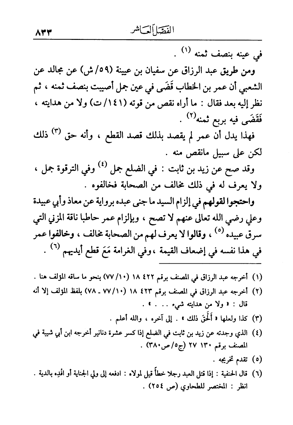 ومن طريق عبد الرزاق عن سفيان بن عيينة عن مجالد عن الشعبي أن عمر بن الخطاب قَضَى في عين جمل أصيبت بنصف ثمنه، ثم نظر إليه بعد فقال: ما أراه نقص من قوته ولا من هدايته، فَقَضَى فيه بربع ثمنه (¬٢).