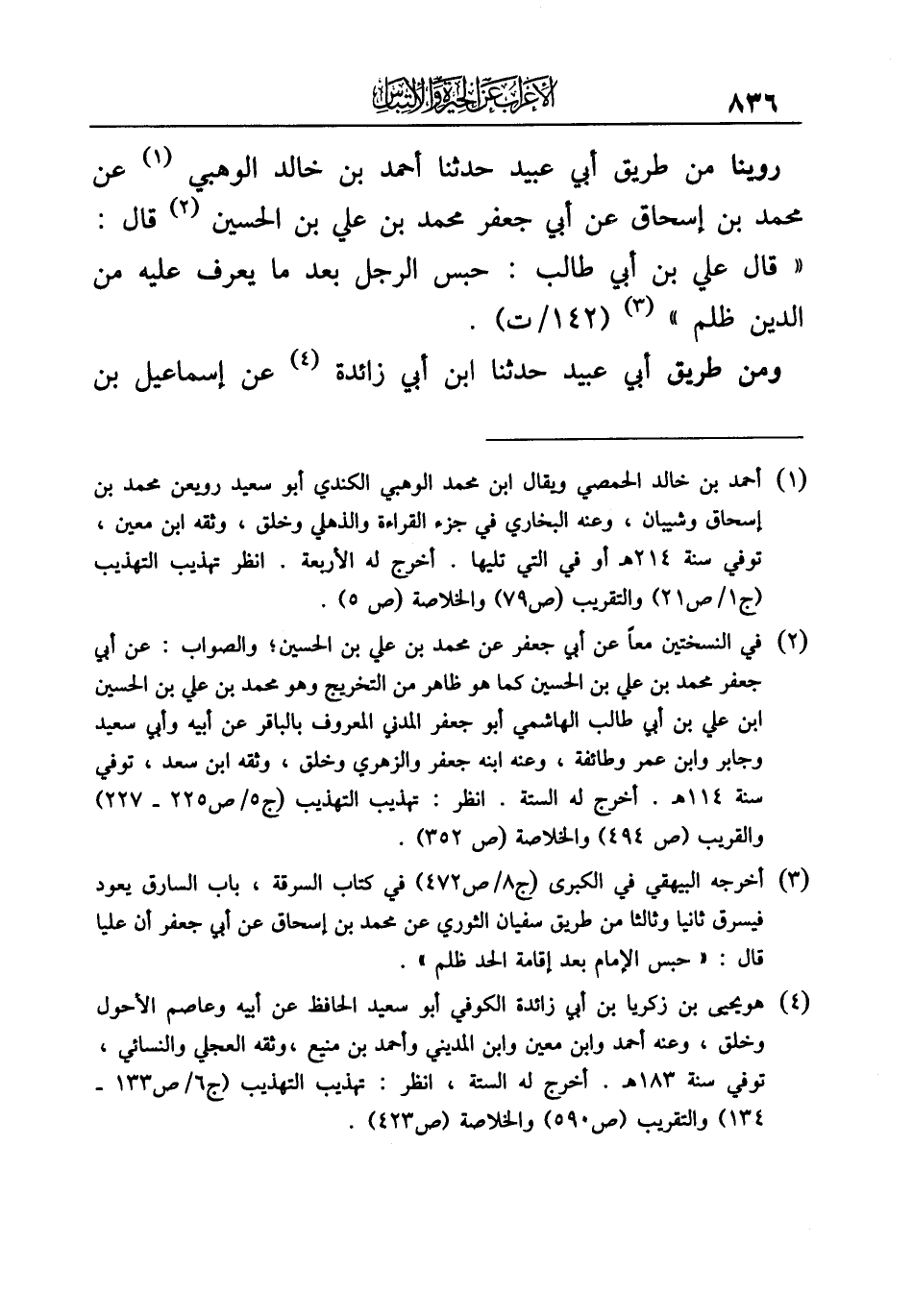 (¬٣) أخرجه البيهقي في الكبرى (ج ٨/ ص ٤٧٢) في كتاب السرقة، باب السارق يعود فيسرق ثانيا وثالثا من طريق سفيان الثوري عن محمد بن إسحاق عن أبي جعفر أن عليا قال: "حبس الإمام بعد إقامة الحد ظلم".