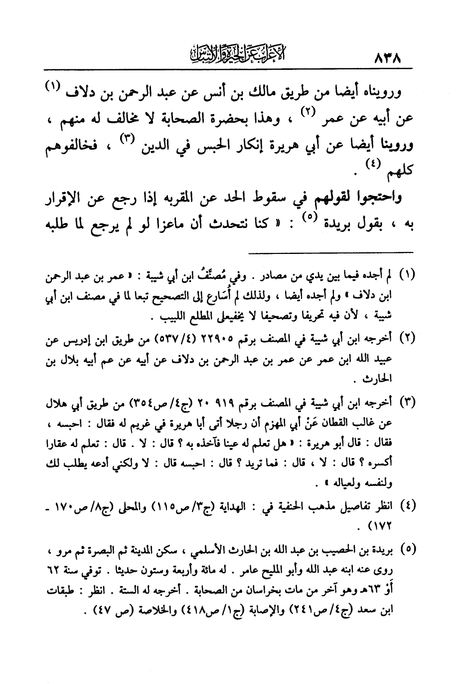 ورويناه أيضا من طريق مالك بن أنس عن عبد الرحمن بن دلاف (¬١) عن أبيه عن عمر (¬٢)، وهذا بحضرة الصحابة لا مخالف له منهم، وروينا أيضا عن أبي هريرة إنكار الحبس في الدين (¬٣)، فخالفوهم كلهم (¬٤).