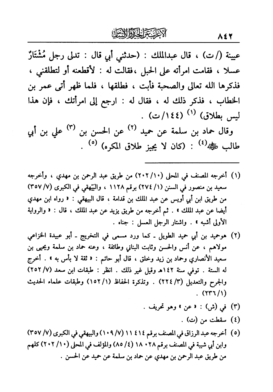 (¬٥) أخرجه عبد الرزاق في المصنف برقم ١١٤١٤ (٧/ ١٠٩) والبيهقي في الكبرى (٧/ ٣٥٧) وابن أبي شيبة في المصنف برقم ١٨٠٢٨ (٤/ ٨٥) والمؤلف في المحلى (١٠/ ٢٠٢) كلهم من طريق عبد الرحمن بن مهدي عن حماد بن سلمة عن حميد عن الحسن.