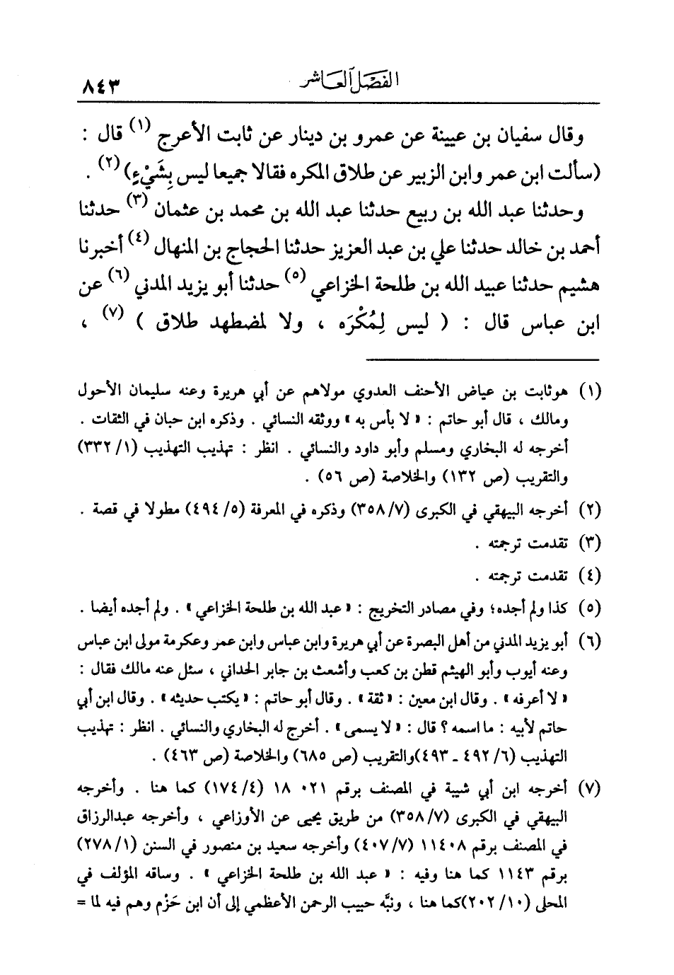 وحدثنا عبد الله بن ربيع حدثنا عبد الله بن محمد بن عثمان (¬٣) حدثنا أحمد بن خالد حدثنا علي بن عبد العزيز حدثنا الحجاج بن المنهال (¬٤) أخبرنا هشيم حدثنا عبيد الله بن طلحة الخزاعي (¬٥) حدثنا أبو يزيد المدني (¬٦) عن ابن عباس قال: (ليس لِمُكْرَه، ولا لمضطهد طلاق) (¬٧)،
