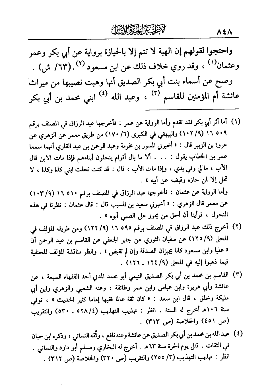 وصح عن أسماء بنت أبي بكر الصديق أنها وهبت نصيبها من ميراث عائشة أم المؤمنين للقاسم (¬٣)، وعبد الله (¬٤) ابني محمد بن أبي بكر