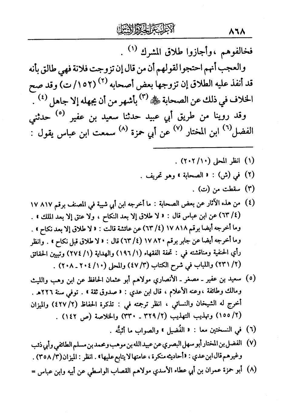 (¬٤) من هذه الآثار عن بعض الصحابة: ما أخرجه ابن أبي شيبة في المصنف برقم ١٧٨١٧ (٤/ ٦٣) عن ابن عباس قال: "لا طلاق إلا بعد النكاح، ولا عتق إلا بعد الملك".