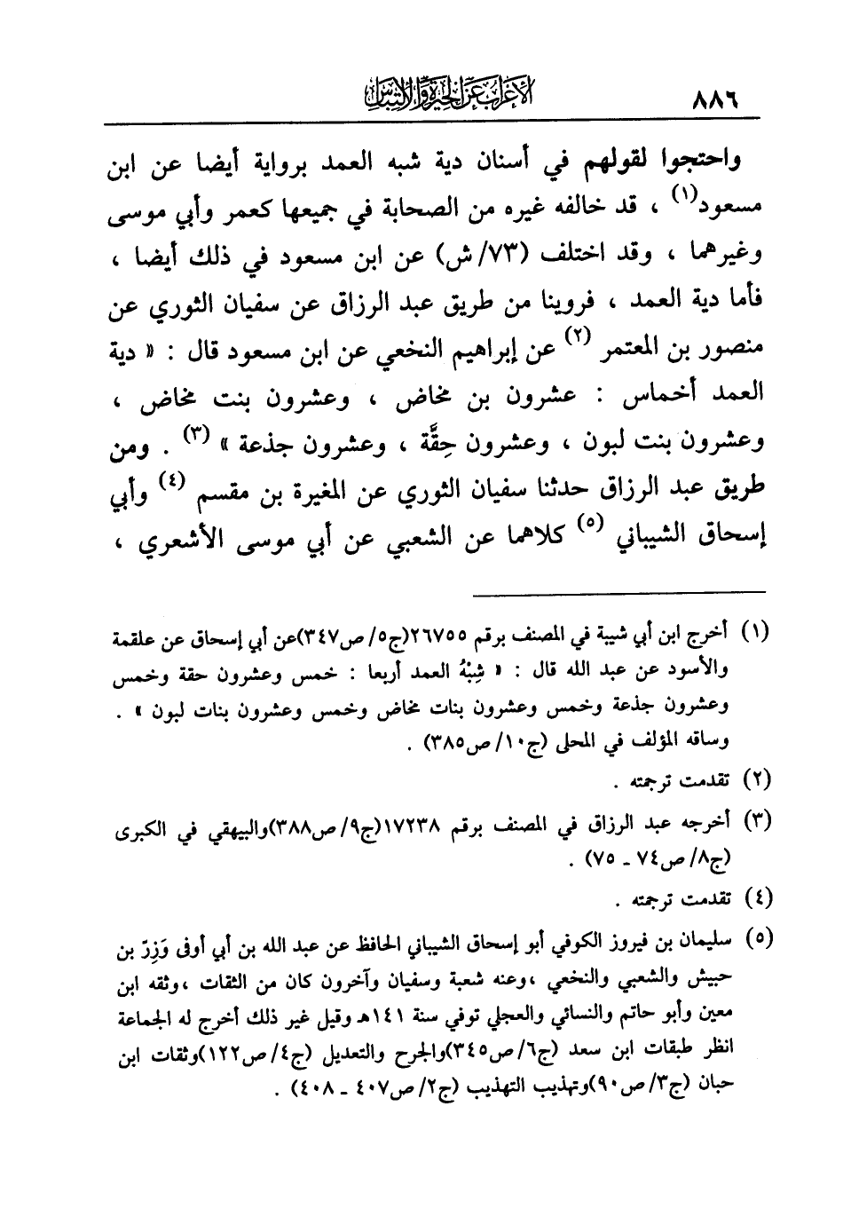 (¬١) أخرج ابن أبي شيبة في المصنف برقم ٢٦٧٥٥ (ج ٥/ ص ٣٤٧) عن أبي إسحاق عن علقمة والأسود عن عبد الله قال: "شِبْهُ العمد أربعا: خمس وعشرون حقة وخمس وعشرون جذعة وخمس وعشرون بنات مخاض وخمس وعشرون بنات لبون".