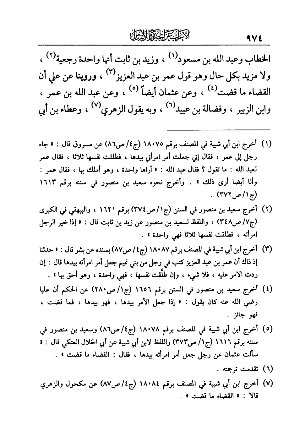 (¬٥) أخرج ابن أبي شيبة في المصنف برقم ١٨٠٧٨ (ج ٤/ ص ٨٦) وسعيد بن منصور في سننه برقم ١٦١٦ (ج ١/ ص ٣٧٣) واللفظ لابن أبي شيبة عن أبي الخلال العتكي قال: "سألت عثمان عن رجل جعل أمر امرأته بيدها، فقال: القضاء ما قضت".
