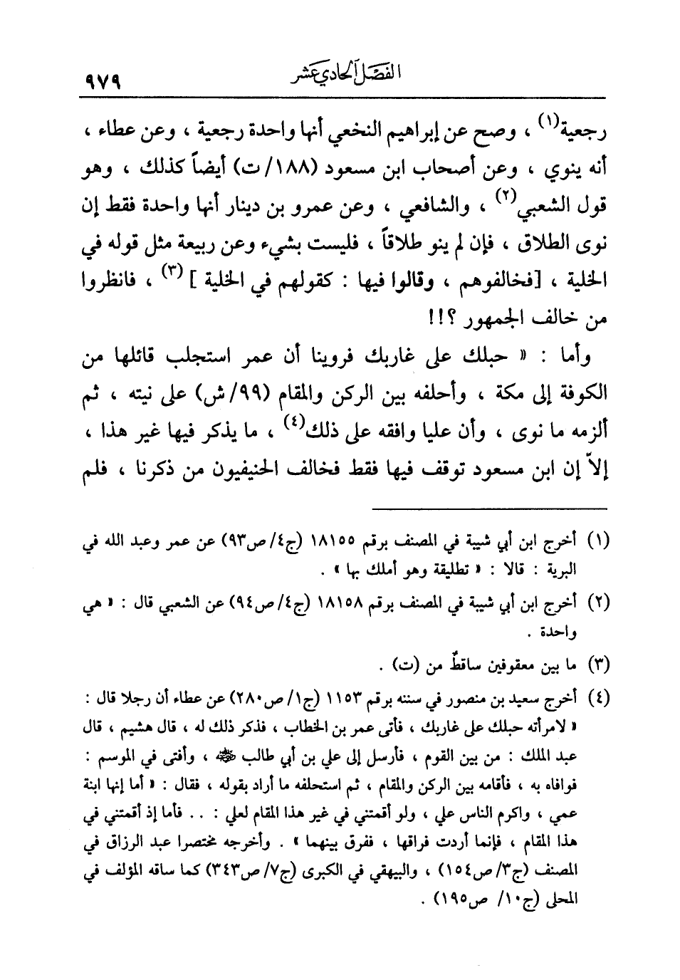 (¬٤) أخرج سعيد بن منصور في سننه برقم ١١٥٣ (ج ١/ ص ٢٨٠) عن عطاء أن رجلا قال: "لامرأته حبلك على غاربك، فأتى عمر بن الخطاب، فذكر ذلك له، قال هشيم، قال عبد الملك: من بين القوم، فأرسل إلى علي بن أبي طالب - رضي الله عنه -، وأفتى في الموسم: فوافاه به، فأقامه بين الركن والمقام، ثم استحلفه ما أراد بقوله، فقال: "أما إنها ابنة عمي، وأكرم الناس علي، ولو أقمتني في غير هذا المقام لعلي: .. فأما إذ أقمتني في هذا المقام، فإنما أردت فراقها، ففرق بينهما". وأخرجه مختصرا عبد الرزاق في المصنف (ج ٣/ ص ١٥٤)، والبيهقي في الكبرى (ج ٧/ ص ٣٤٣) كما ساقه المؤلف في المحلى (ج ١٠/ ص ١٩٥).